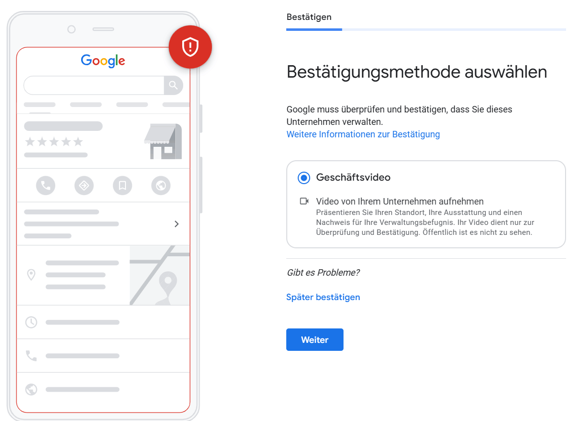Google muss bestätigen, dass dein Unternehmen wirklich existiert. Die Verifizierung erfolgt je nach Fall über: