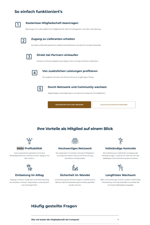 Das Schweizer Einkaufsnetzwerk Compera möchte mit ihrer verkaufsstarken Website ihre Mitgliedschaft bewerben. Hierfür fokussieren wir uns darauf, den Interessenten genügend qualitative Informationen zu geben, sowie die Vorteile klar und gezielt hervorzuheben.