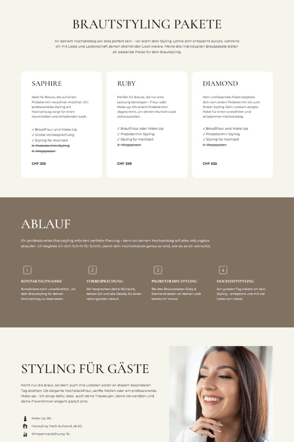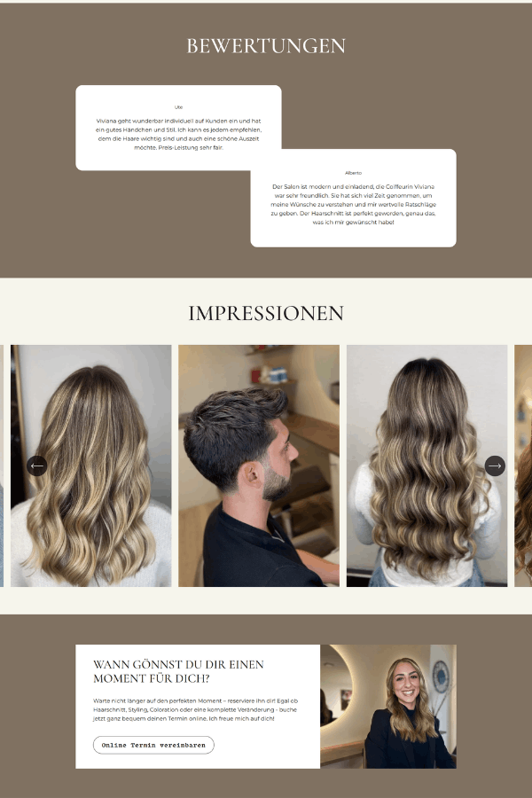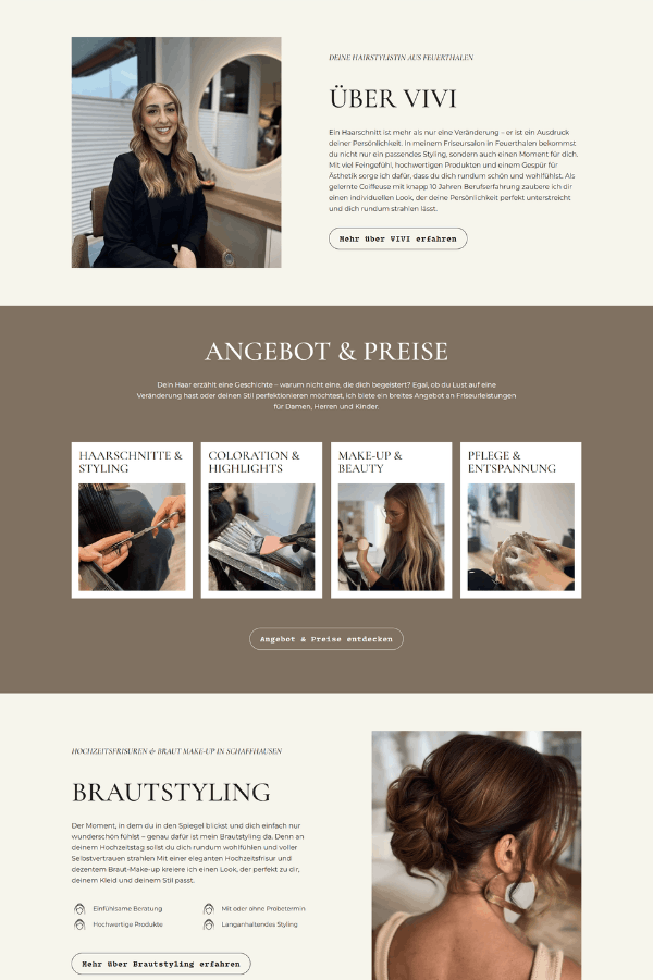 Viviana aus startete frisch in die Selbständigkeit und brauche eine simple Website, mit der sie ihre Leistungen, Preise und Arbeiten präsentieren kann. Die Website sollte Eleganz und Zeitlosigkeit ausstrahlen und dabei helfen, den Terminkalender voll zu kriegen.